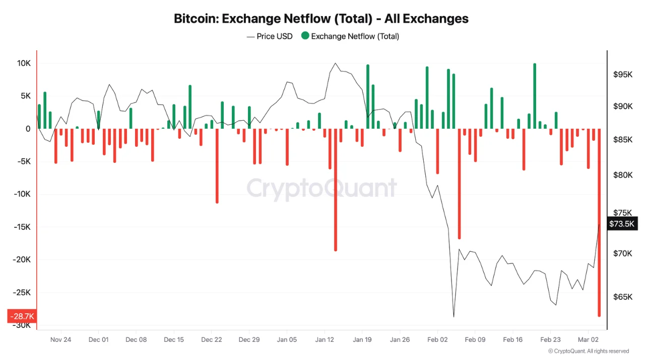 以当前价格计算,单日28,700枚比特币流出相当于约20.7亿美元撤离交易所。无论如何衡量,这都是显著的资金变动,多数情况下会被视为短期价格的强烈积极信号。