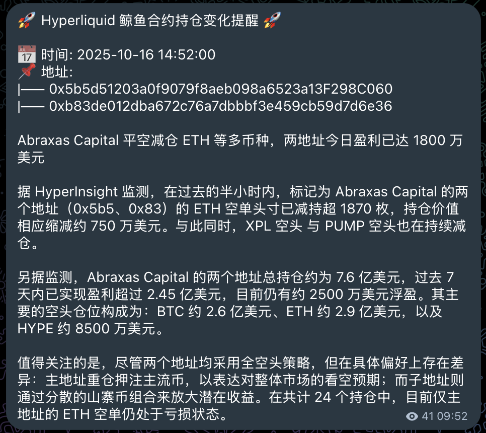 为应对近期市场波动,加密货币基金Abraxas Capital采取战略性操作,平仓部分以太坊(ETH)和各类山寨币空头头寸,锁定可观收益。HyperInsight数据显示,该基金10月16日通过两个钱包地址在短短两小时内平仓超1,870枚ETH,这笔交易使持仓价值减少约750万美元。与此同时,XPL和PUMP合约头寸也出现阶段性缩减。