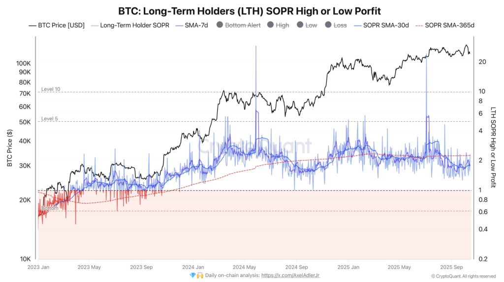 比特币长期持有者(LTH)近期显著增加抛售活动,引发对持续上涨动能的担忧。据CryptoQuant数据显示,LTH已实现平均超过130%的盈利,当前支出产出利润率(SOPR)高达2.32。
