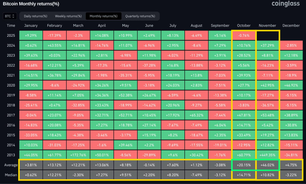 尽管存在抛售趋势,历史季节性规律仍支持比特币在10-11月走强。Coinglass数据显示,这两个月平均回报率分别为+20.15%和+46.02%。