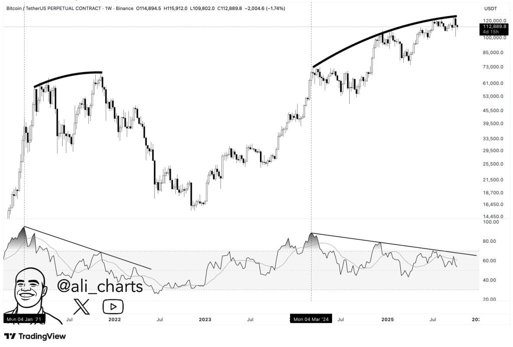 技术指标同时发出动能减弱警告。分析师Ali指出比特币周线图正在形成看跌背离,尽管价格创新高,但RSI呈现下降趋势。
