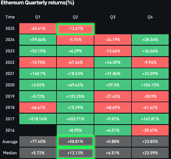 “第二季度ETH的平均回报率为58%。我们已经等待得够久了;现在是反弹的时候了!”