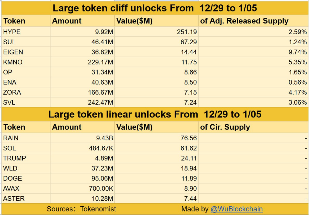 HYPE、SOL、DOGE、RAIN、EIGEN和ASTER因解锁时间面临最大压力。