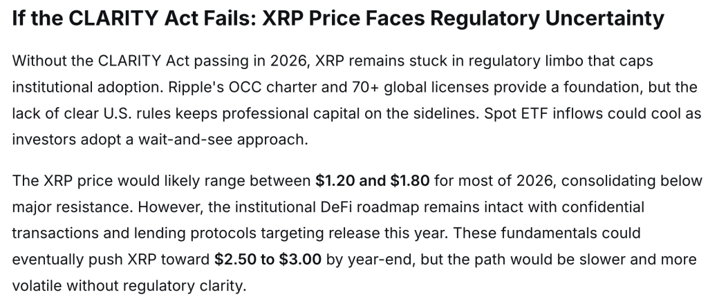 如果《清晰法案》未能落实,XRP很可能将继续停留在监管的灰色地带,价格波动范围宽泛。尽管瑞波公司拥有OCC执照及全球超过70个许可证,根基稳固,但美国缺乏明确的规则导致机构投资者入场意愿不足。随着时间向2026年推进,XRP的交易区间很可能维持在1.20美元至1.80美元左右。