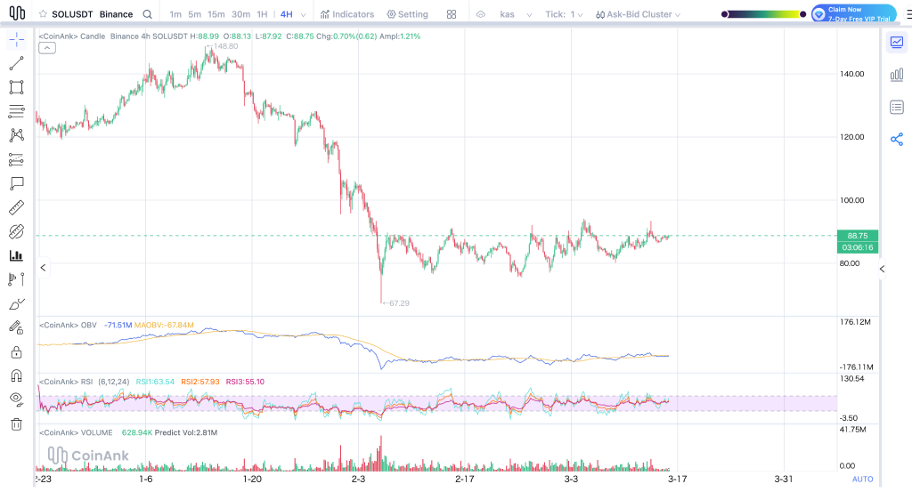 RSI读数显示,快速RSI为63.54,中期和慢速分别为57.93和55.10,表明动能正在积聚。成交量628,940 SOL,远低于预测的281万。