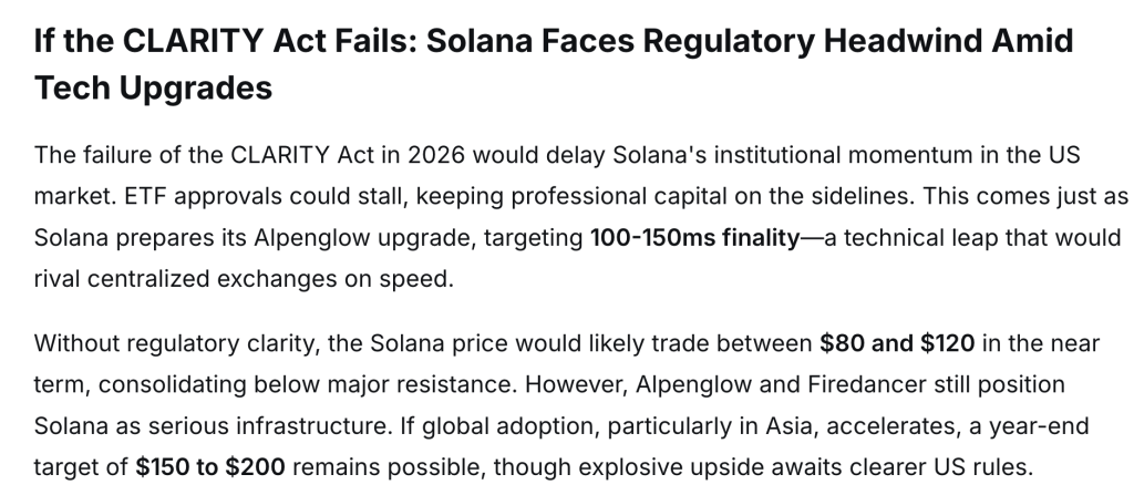 如果《清晰法案》未能通过,Solana可能会失去部分来自机构的推动力。ETF的批准可能耗时更长,专业资金或持观望态度。Solana同时也在为即将到来的Alpenglow升级做准备,目标是将最终确认时间缩短至100到150毫秒。这是一项重大的技术改进,可与传统交易所的能力相媲美。