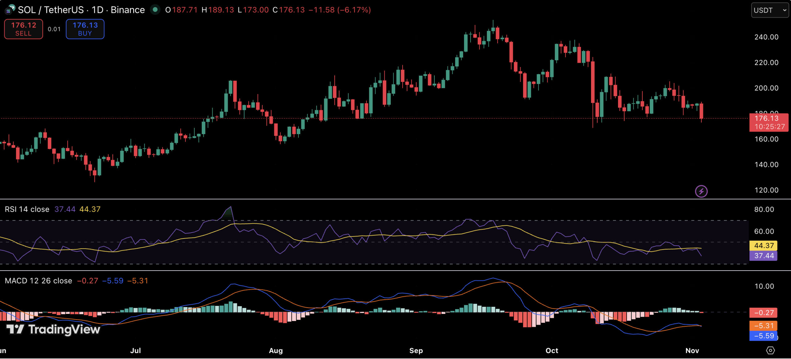 最新MakroVision分析表明,Solana"低点逐步抬高"的结构仍然完整,但动量指标正在弱化。RSI已跌破中性50线,反映买盘动能衰减;MACD柱状图近期转负,出现近一个月来首次看跌交叉。