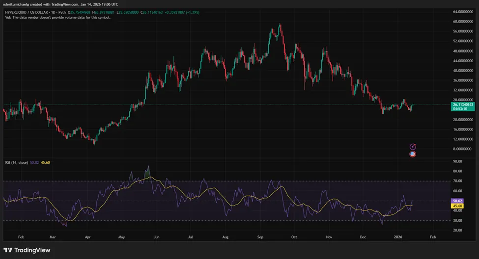 尽管价格走势看涨,但HYPE价格仍处于其4周以来的底部区间内。具体来看,截至发稿时其26美元左右的价格,大致比其在2025年的最高价格水平低了约55%。