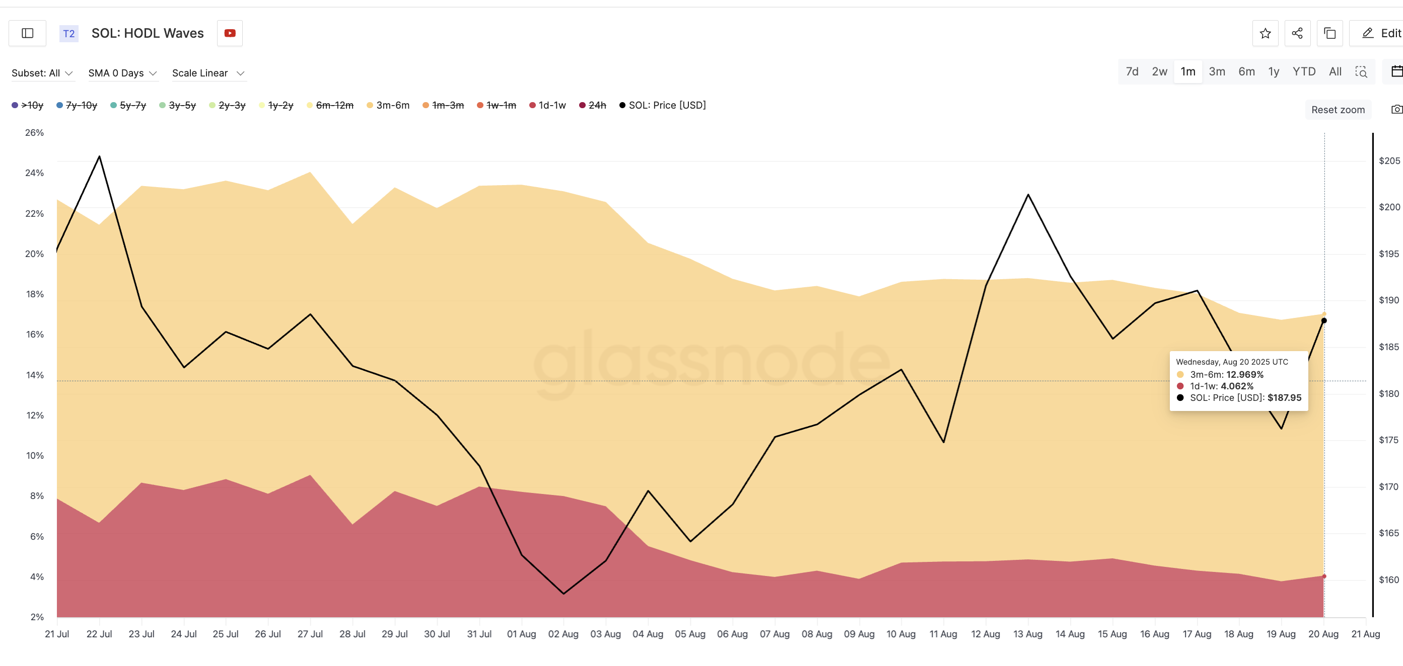 SOL的3-6个月持有群体(中期持有者)比例已从7月21日的14.84%降至8月20日的12.96%。这表明那些在本轮上涨中持仓较久的钱包正在主动离场。