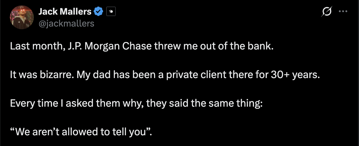 去年十一月,比特币支付公司Strike首席执行官杰克·马勒斯透露其无端被摩根大通终止银行服务。马勒斯在社交媒体上表示:"每次询问原因,得到的都是同一套说辞:'我们无权告知'。"同年十二月,摩根大通还以涉嫌涉及受制裁地区业务为由,冻结了稳定币初创公司BlindPay和Kontigo的银行账户。