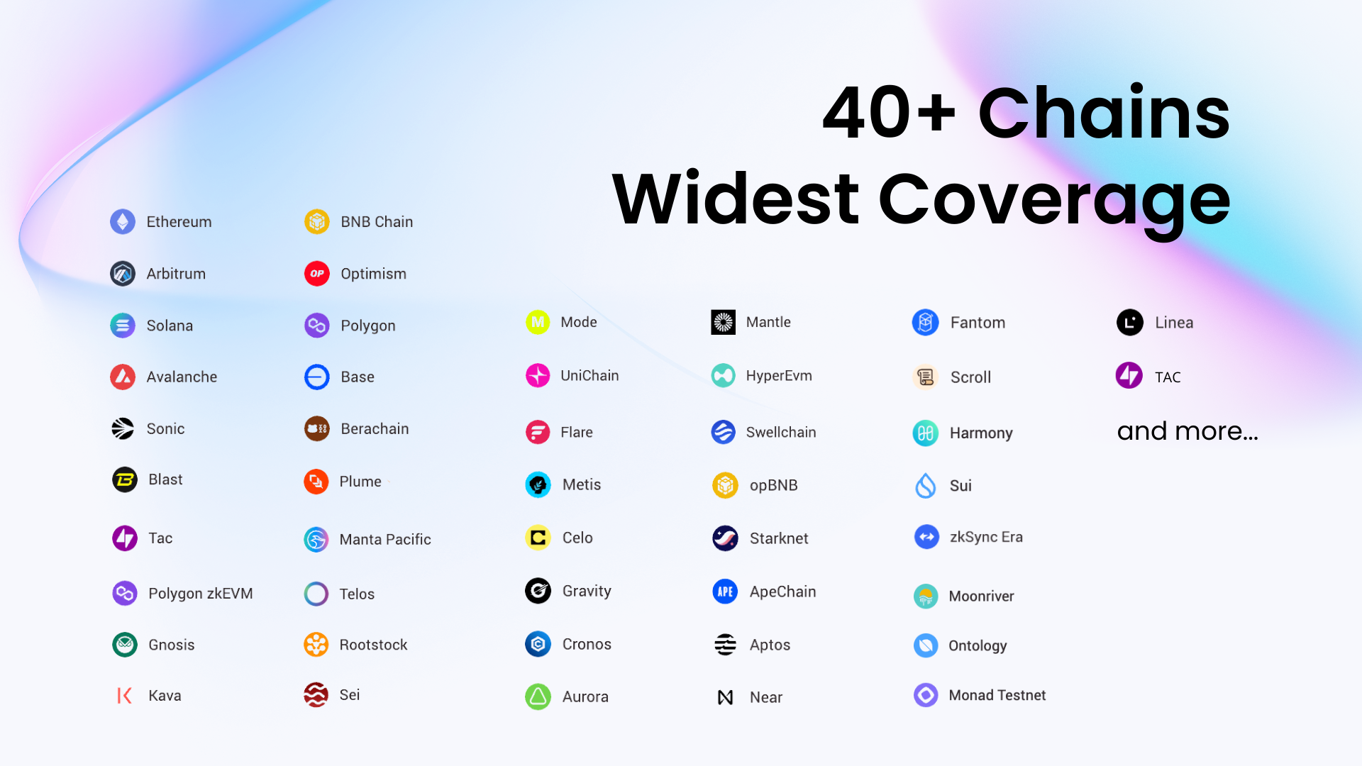 ● 覆盖最广泛的40多条区块链网络,包括EVM、非EVM及L2网络