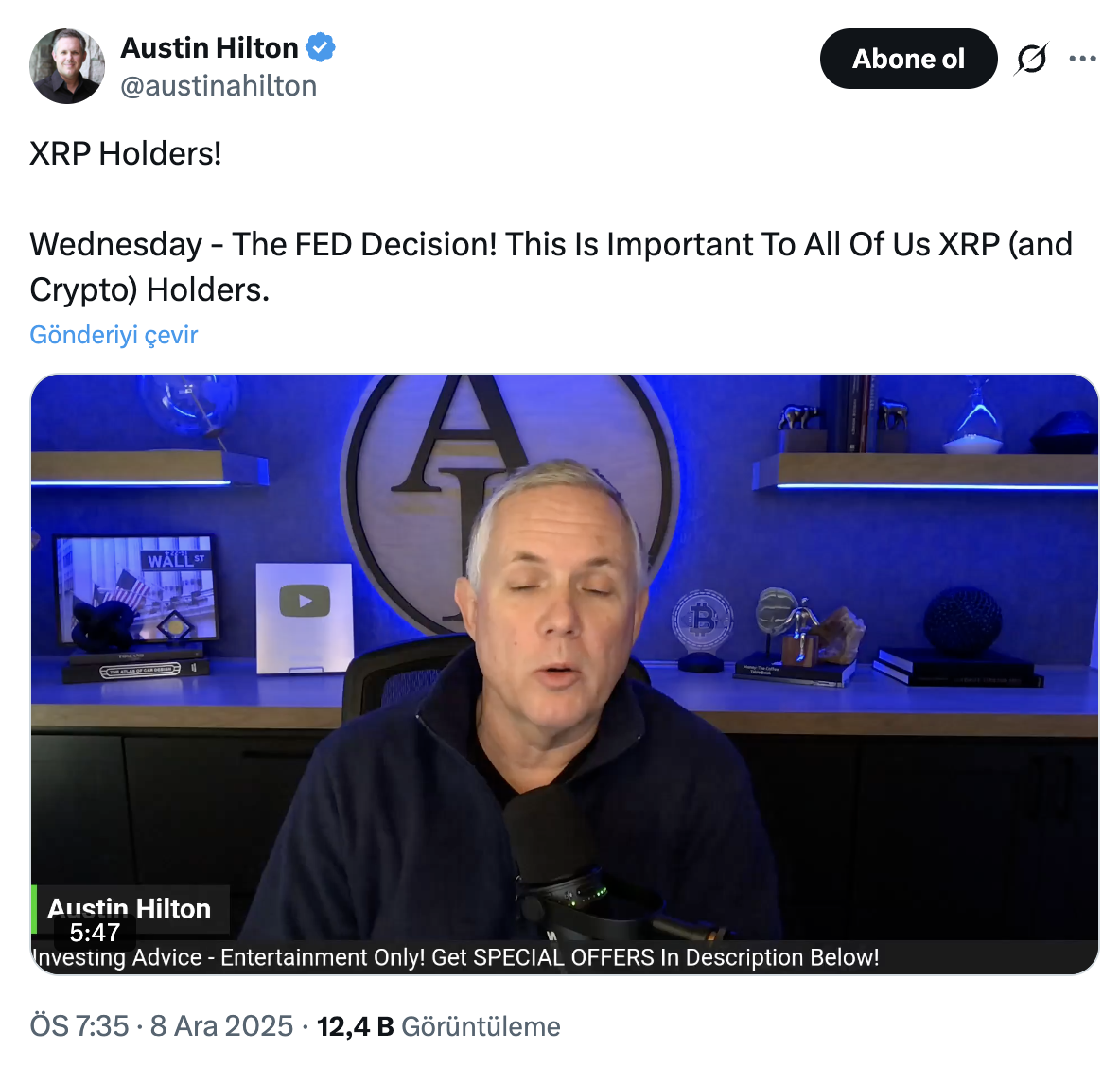 著名加密货币评论员奥斯汀·希尔顿本周指出,一项关键宏观经济动向再次将XRP投资者的注意力引向美联储。随着周三利率决议公布时间临近,专家普遍认为该决策可能对XRP产生直接影响。