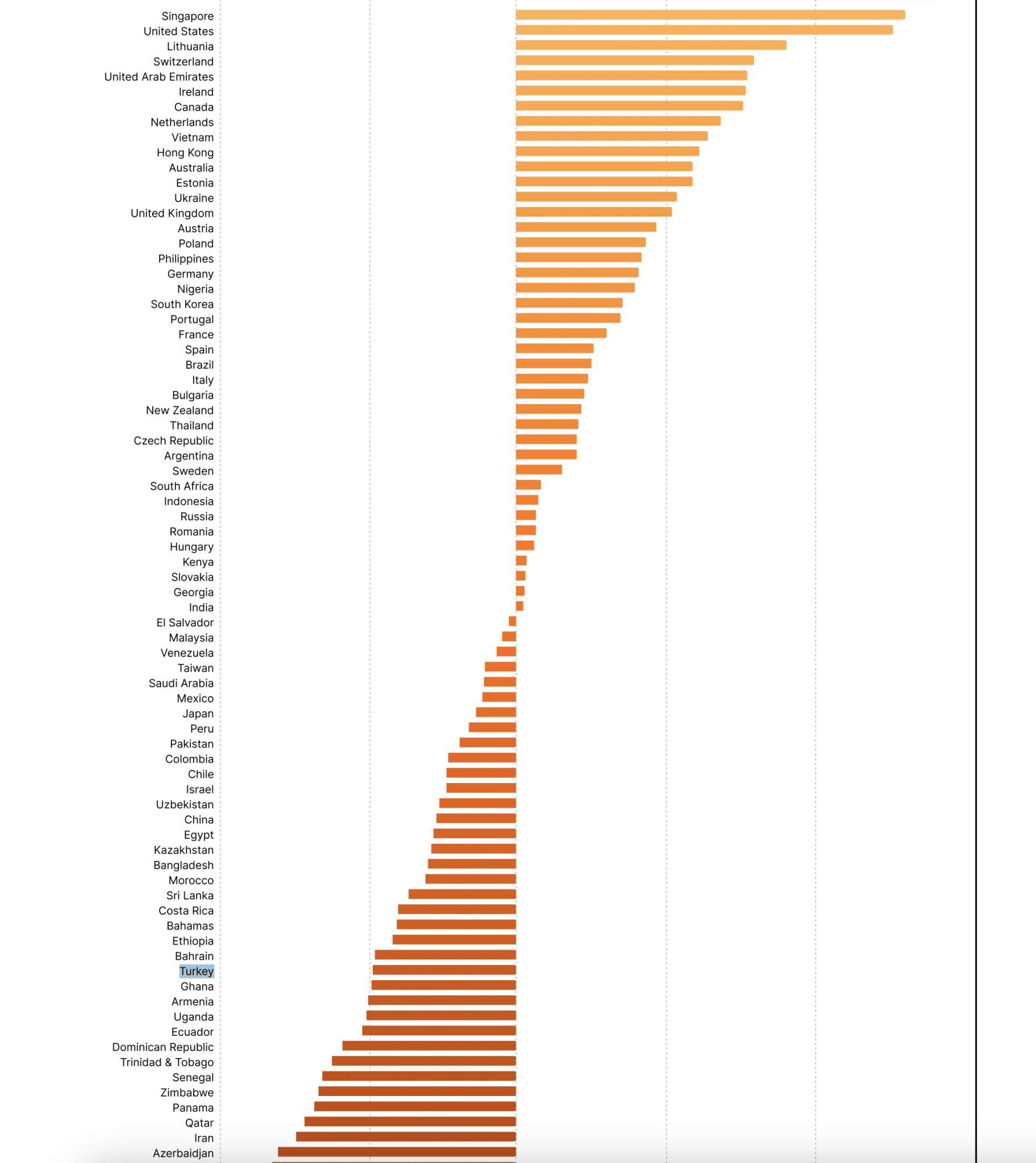报告分析称:“土耳其凭借强劲的DeFi网络流量位列全球第7,加密货币持有率相对较高,在用户渗透率榜单中排名第15位。尽管应用广泛,但正规基础设施仍显薄弱——许可证发放有限、法币支持不足、政策框架不明。在机构准备度排名第54的土耳其,市场主要以非正规化和零售为导向,用户多在缺乏强力机构支持的环境下进行加密货币交易。”