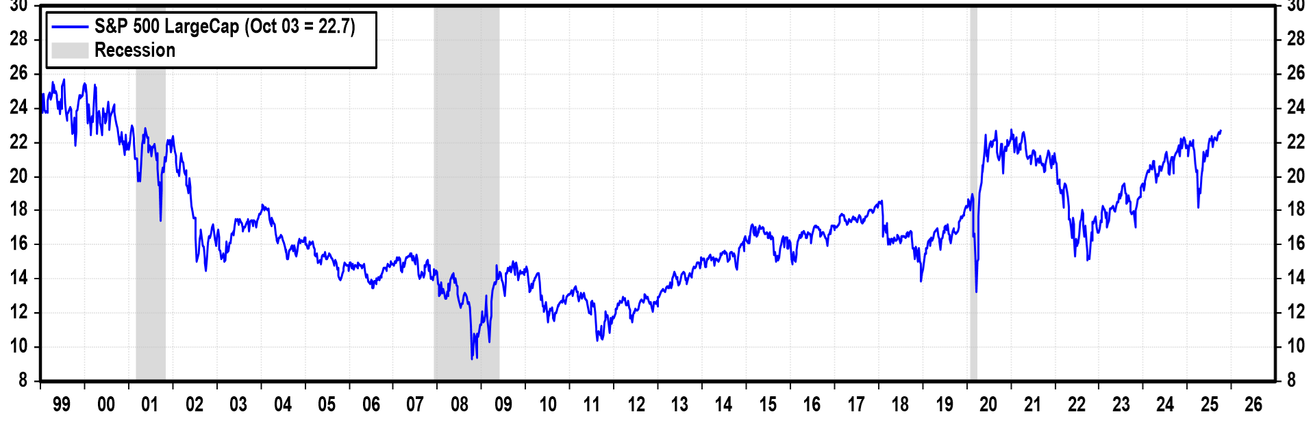 当前的市场动态与1999年不同,如今的货币政策倾向于持续增长而非紧缩,这进一步推动了投机势头。市场估值仍处于适度水平——标普500的市盈率表明,在进入泡沫区域之前仍有进一步扩张的空间。