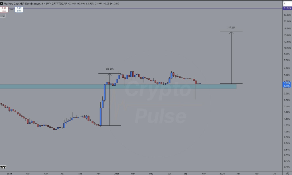 XRP保持4%的市场主导地位,这一水平曾在其历史上涨行情中触发三倍涨幅。