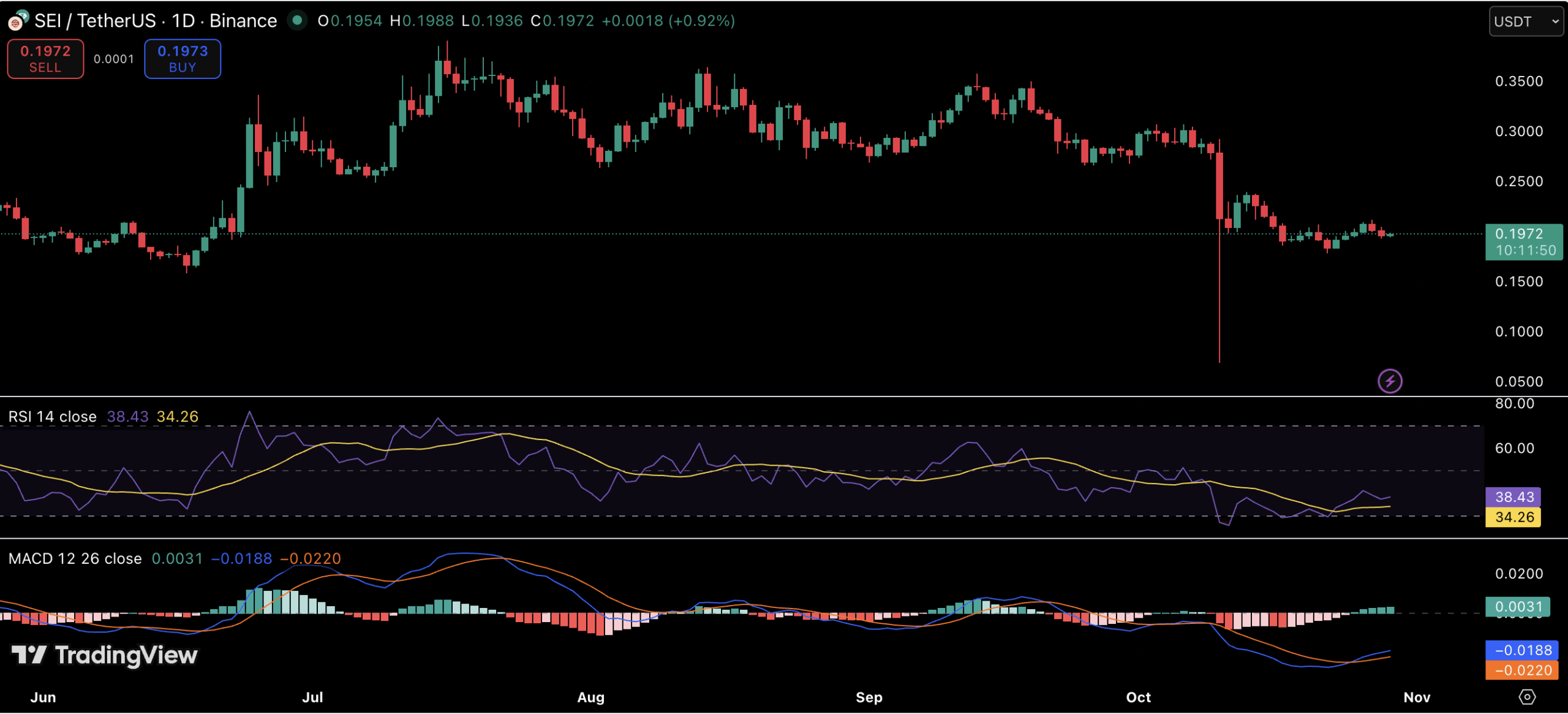 经过数周横盘整理后,SEI成功守住0.19美元关口,表明抛压或已耗尽。当前RSI指标从超卖区38位置回升,MACD线即将上穿信号线——这种经典形态往往预示着趋势反转。