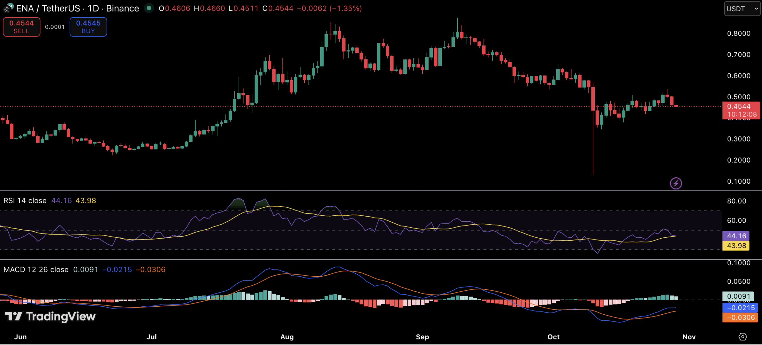 Ethena项目的ENA代币在10月低点获得稳固支撑后,悄然围绕0.45美元盘整。当前RSI回升至44脱离看跌区间,MACD指标转正暗示动能积聚。