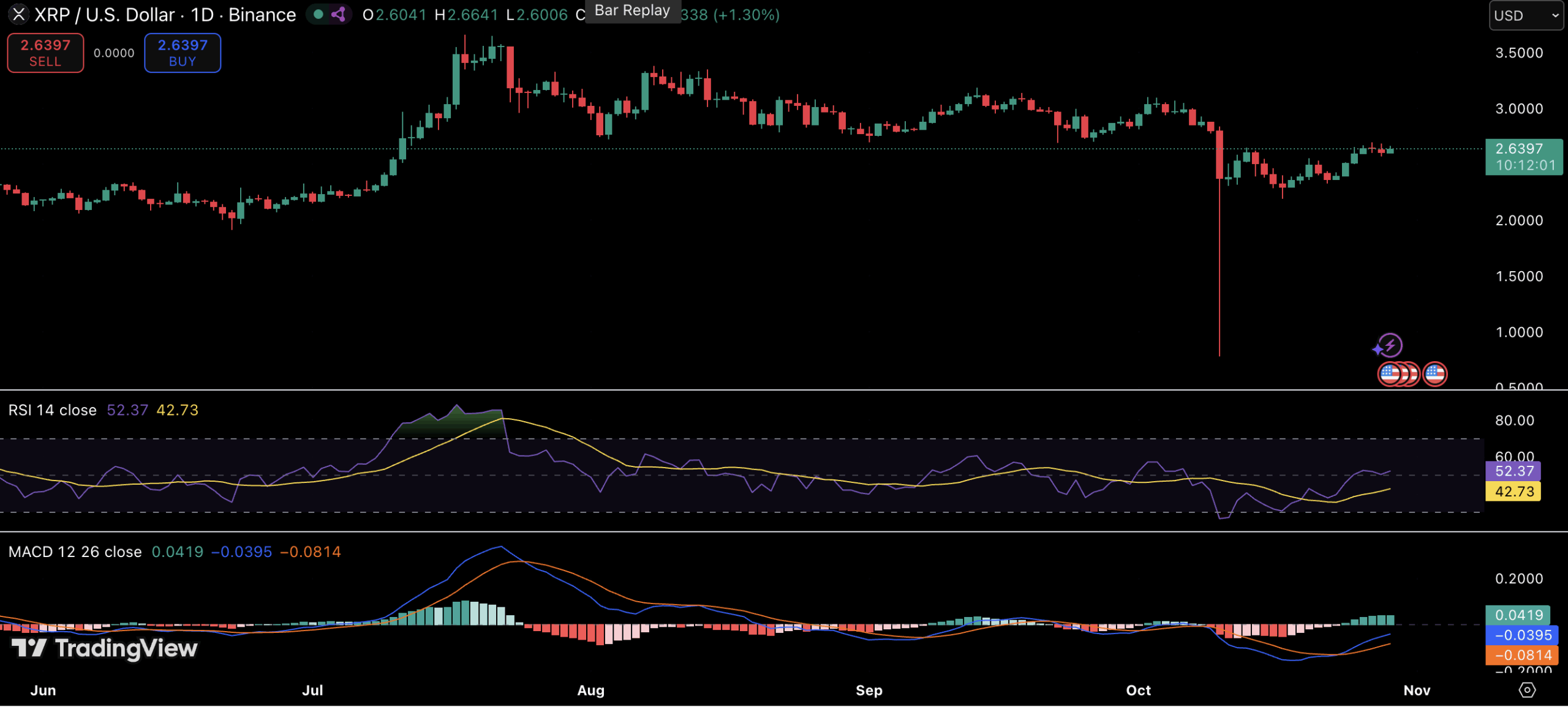 XRP正悄然收复失地,在10月深度回调后回升至2.64美元附近。技术指标呈现改善迹象:RSI维持在52上方,MACD值转为正值。