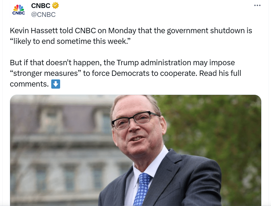 持续三周有余的政府停摆已冻结监管职能,延迟市场决策,并为加密货币行业蒙上阴影。最新进展显示,前白宫经济顾问凯文·哈塞特认为停摆接近尾声。据其透露,本周或将达成解决方案,这将缓解联邦机构压力,为加密政策推进打开窗口。