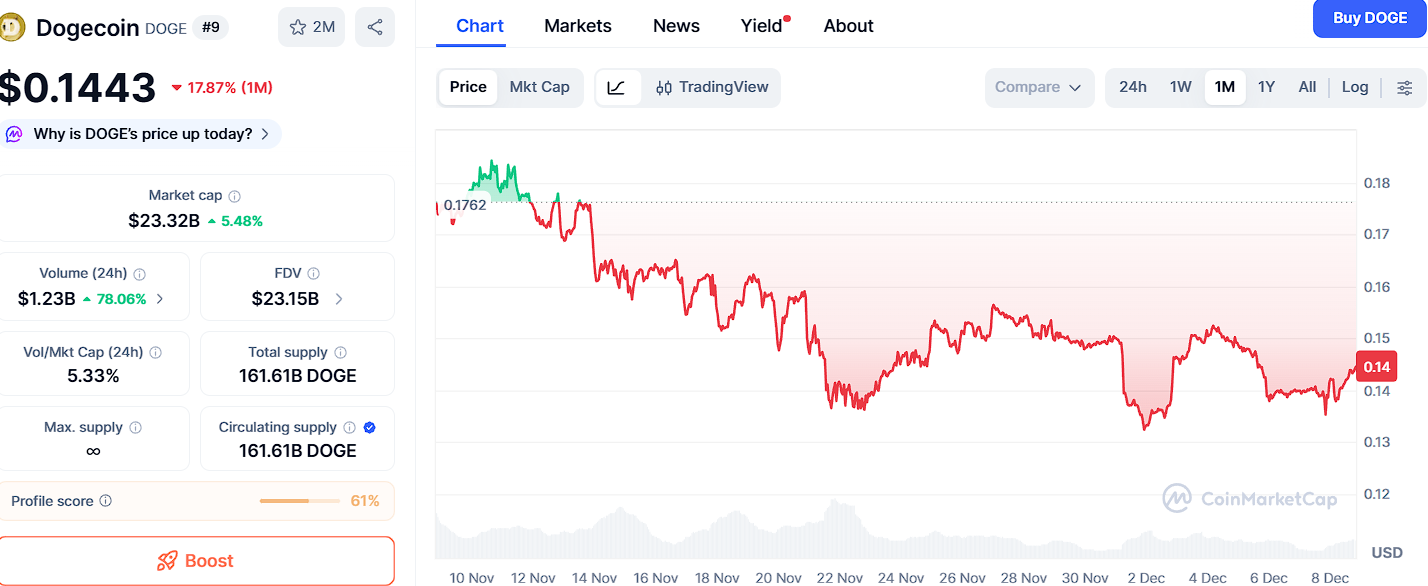 Dogecoin交易于0.1428美元附近,在深度社区参与支撑下维持稳定升势。0.1380美元支撑位守护近期波动区间,更深层的0.1325美元与0.1270美元区域构筑的加固基底,往往预示着更大规模的模因行情。当DOGE重新测试0.1480美元阻力位后,将形成向上延续态势,0.1550美元与0.1620美元则是经典突破目标。