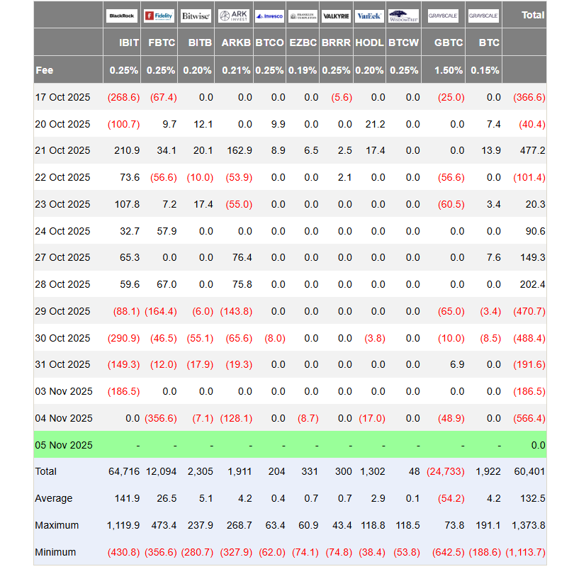 其中31.9万枚比特币持仓时长为6-12个月,显示持有者倾向于在当前价位套现。ETF资金持续流出进一步加重现货市场压力,11月4日比特币ETF单日流出超5.66亿美元。自10月29日起,ETF资金流出总额已接近20亿美元,超过此前620亿美元累计流入的纪录。