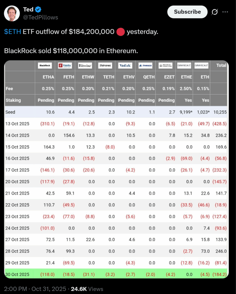 尽管近日出现数次回调,但每次反转时多头都会逢低买入吸收抛压。交易者需密切关注3800美元价位。市场分析师Ted Pillows报告称,10月30日以太坊现货ETF出现1.84亿美元净流出,其中贝莱德占1.18亿美元。CoinGlass数据显示周流出量攀升至3.86亿美元,仅少量资金流入抵消损失。