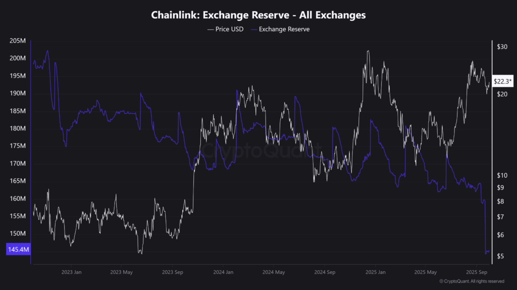 2024年底至2025年期间,LINK价格从8美元回升至30美元,而交易所储备量达到两年低点。机构兴趣和链上基础设施发展推动了Chainlink的价格上涨动能。