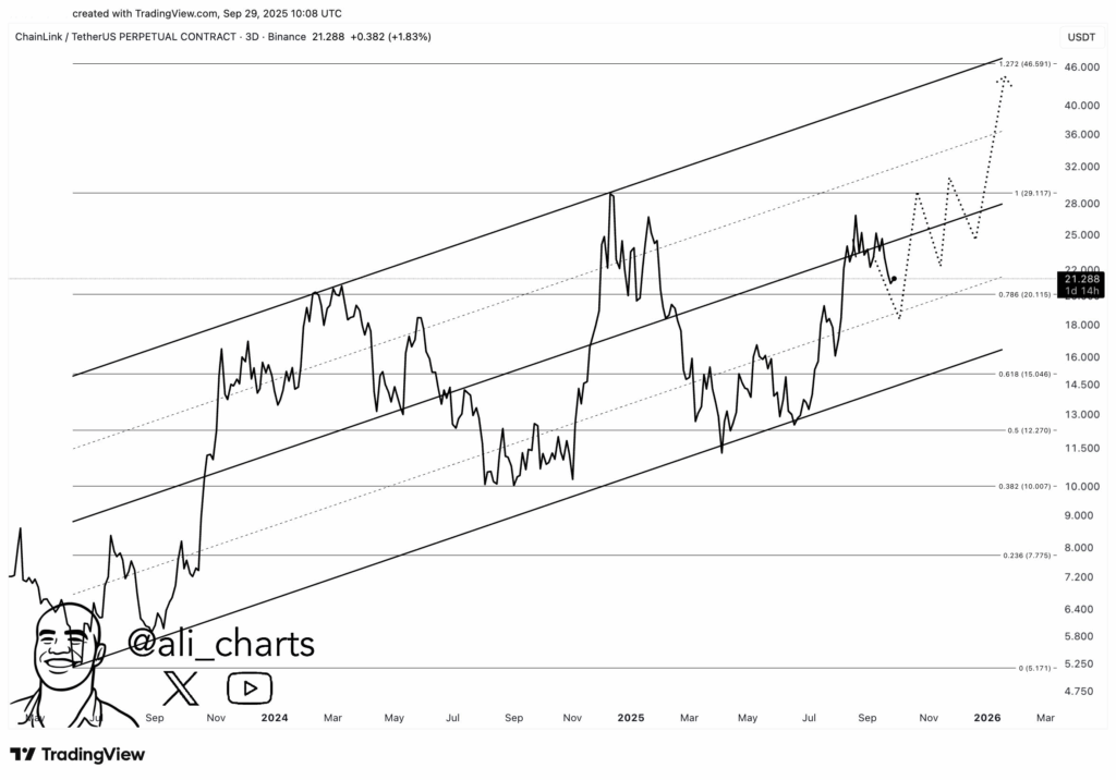 分析师Ali Martinez预测,守住20美元支撑位后,LINK下一目标价位为47美元。分析师Michael van de Poppe指出Chainlink正进入更高时间框架的支撑区域,极大概率维持在20美元上方,下一轮上涨有望创历史新高。
