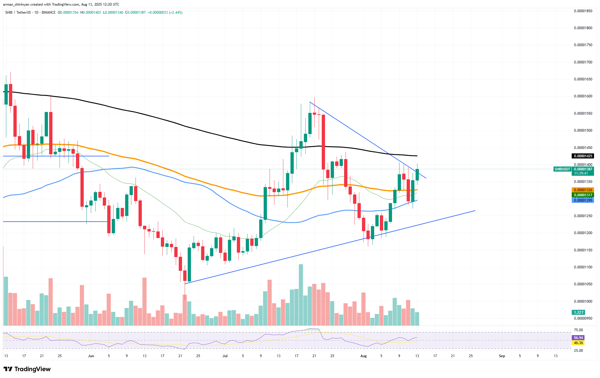 历史上,新钱包创建量的激增往往预示着市场活跃度的提升,这种流动性注入和交易量增长能为上涨趋势提供支撑。从技术面看,SHIB刚刚突破了持续数周的上升趋势线阻力位