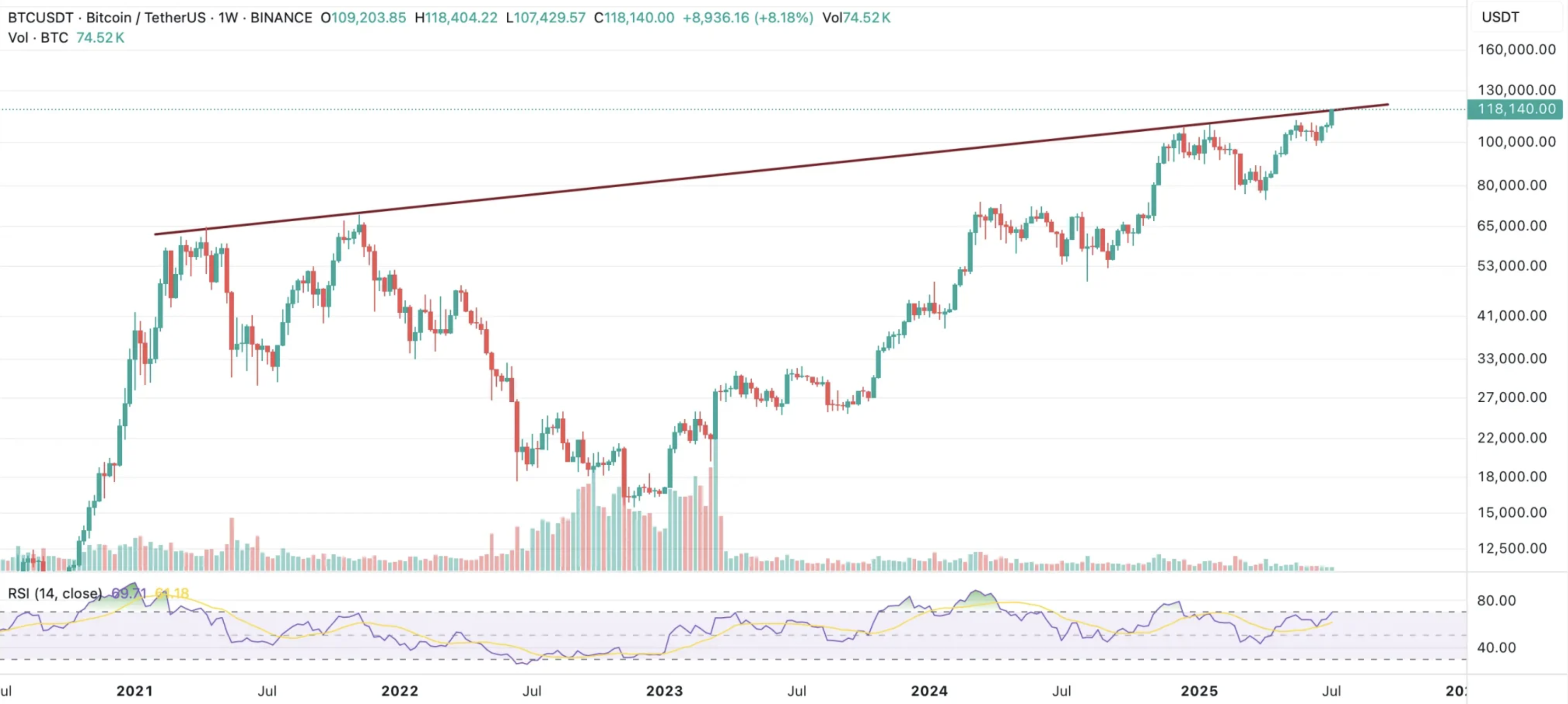 2025年7月11日,比特币价格飙升至历史新高118,404美元。这一强劲上涨由机构资金流入、交易所供应减少以及美国可能建立国家比特币储备的讨论推动。机构交易量持续增长,ETF资金流入达数十亿美元,形成强大的买压打破供需平衡。美元走弱和美联储降息预期增强进一步巩固了比特币作为避险资产的吸引力。分析师指出相对强弱指数(RSI)尚未进入超买区域,将130,000美元视为下一个目标价位。