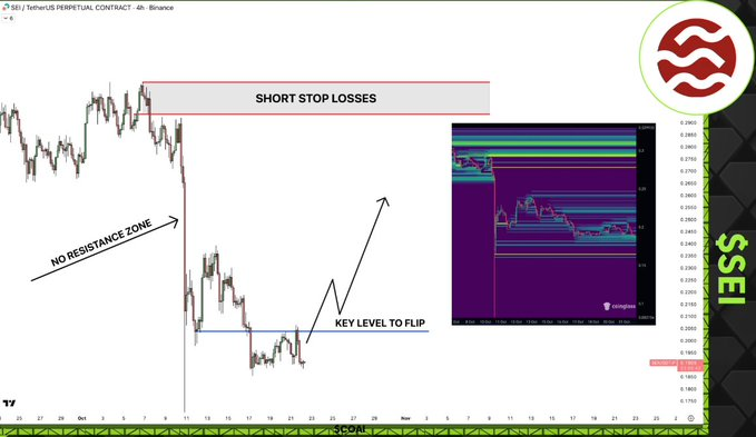 若SEI能伴随放量收复0.20美元,这种结构将增强看涨潜力。中期阻力的缺失使价格发现过程更为迅速,通常由空头回补和投机性买盘推动形成脉冲式波动。价格走势与流动性池的视觉对称性增强了预测可信度。