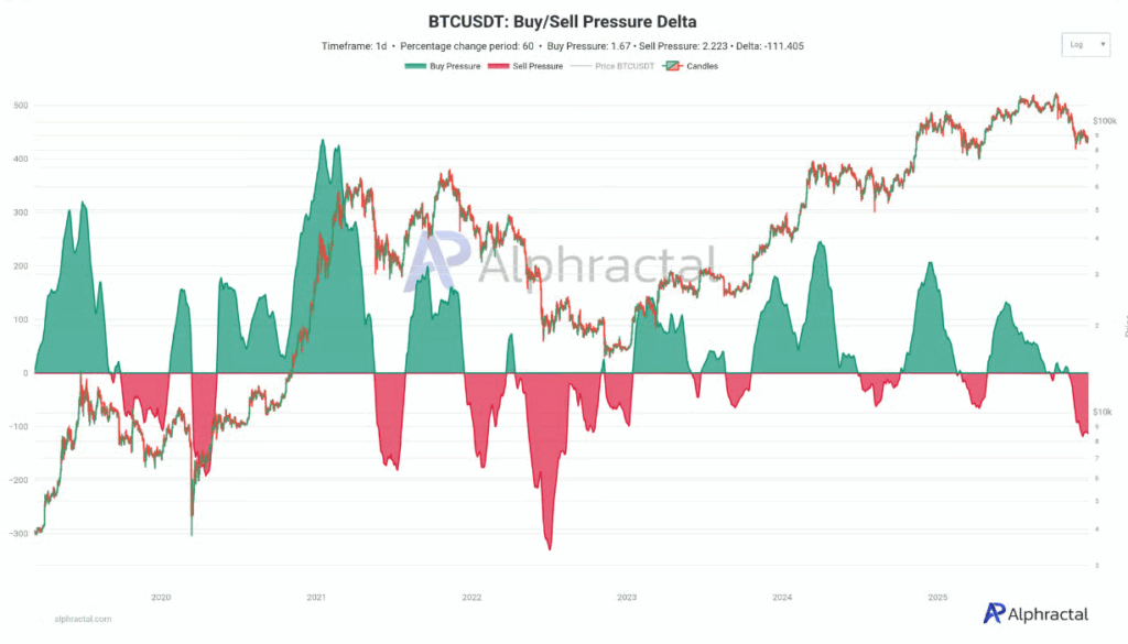根据Alphractal的数据,比特币正面临自2022年以来最强的市场抛售压力。下图显示了数据交叉点,表明比特币买卖压力之间存在差值。深入分析揭示了一个明确信号:抛压已回归,其强度与上一轮熊市底部时相似。
