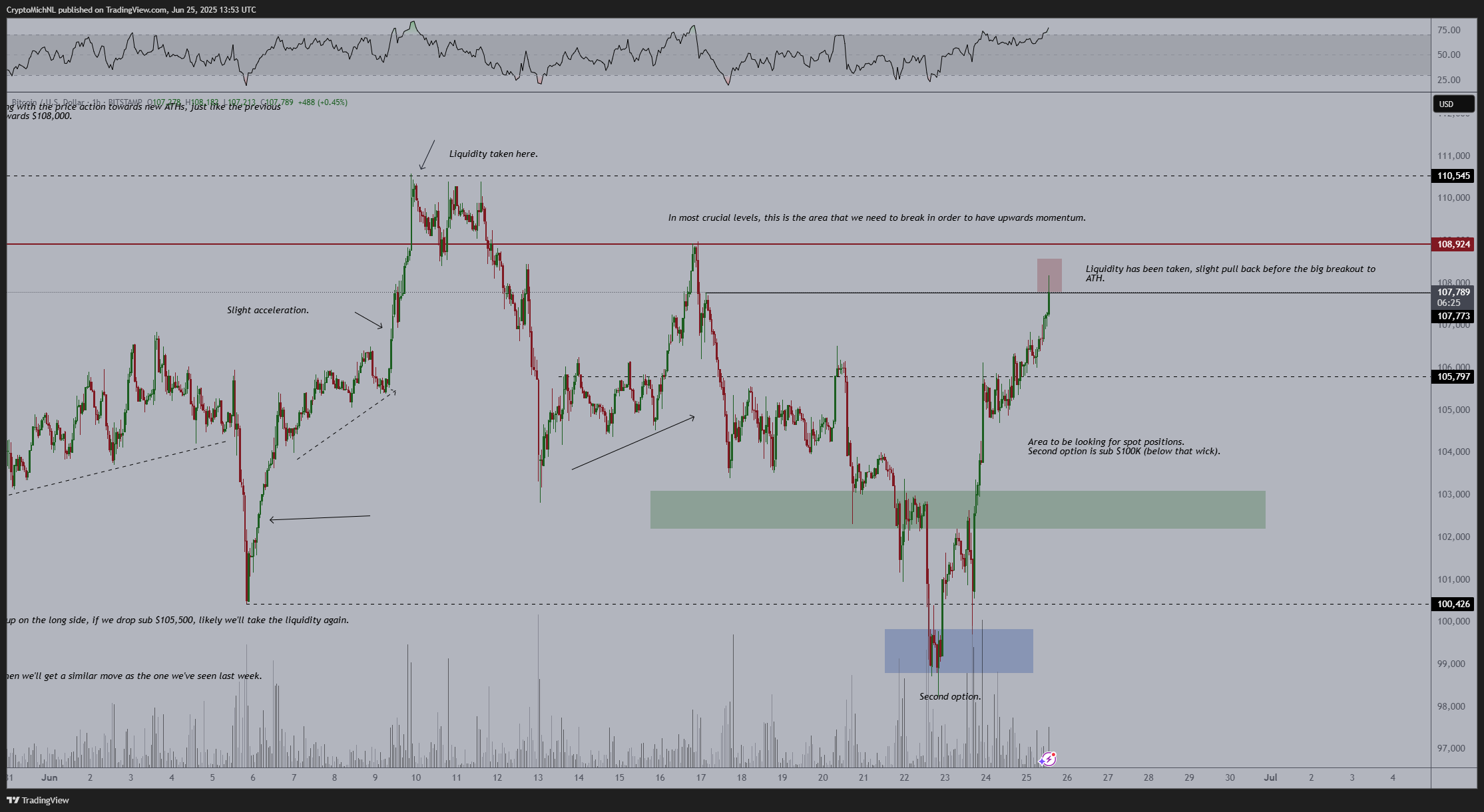 Van de Poppe指出比特币当前的上升趋势,并表示尽管可能出现短暂的横盘整理,但整体轨迹仍保持看涨。他将108,900美元视为突破历史纪录前的最后一道重要阻力关卡。