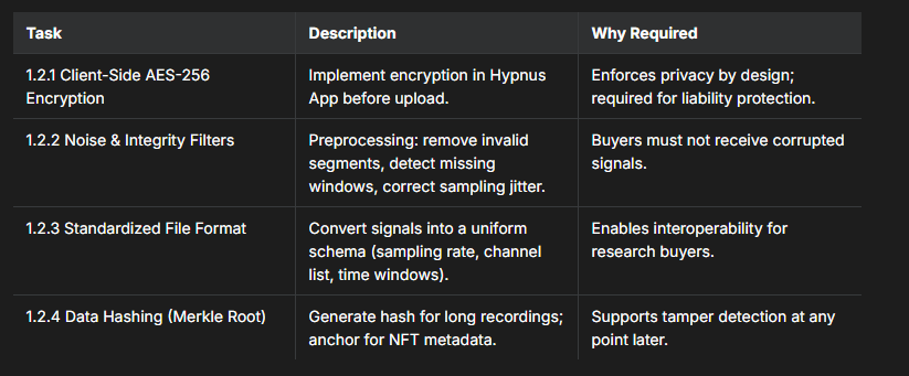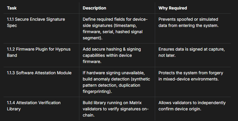 目标:构建完整流水线,确保睡眠数据真实可信,在本地完成加密处理,附加可验证元数据,并将其完整性锚定在Matrix上。此阶段是后续所有阶段的基石,缺失则无法实现数据可信、定价或使用。