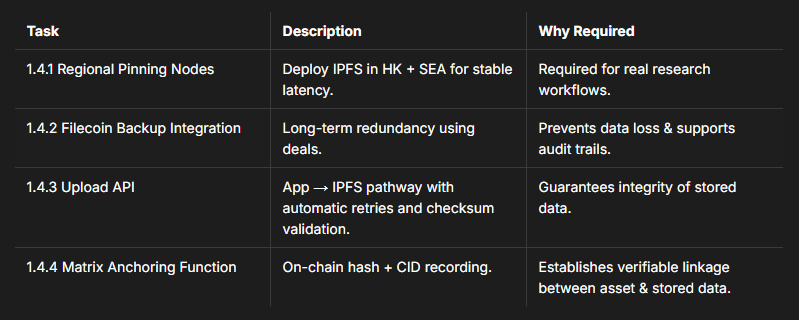 交付成果:区域化IPFS集群、Filecoin冗余备份、锚定智能合约