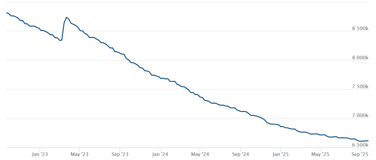 八月美国职位空缺数骤降至723万,接近五年低点。经济学家警告称,申领失业救济人数(约为去年同期的两倍)可能预示经济放缓。尽管标普500指数因市场预期美联储将进一步降息和注入流动性而表现坚挺,但这些数据仍引发投资者担忧。