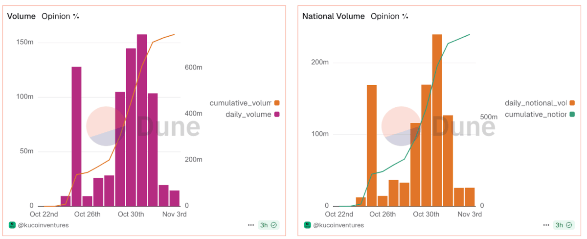 KuCoin Ventures创建的Dune仪表板显示,Opinion平台在10月31日单日交易量飙升至1.57亿美元,截至11月初累计突破6亿美元。平台的国家级交易图表呈现相似趋势,11月3日峰值时日交易量超2亿美元,未平仓合约金额亦显著增长。