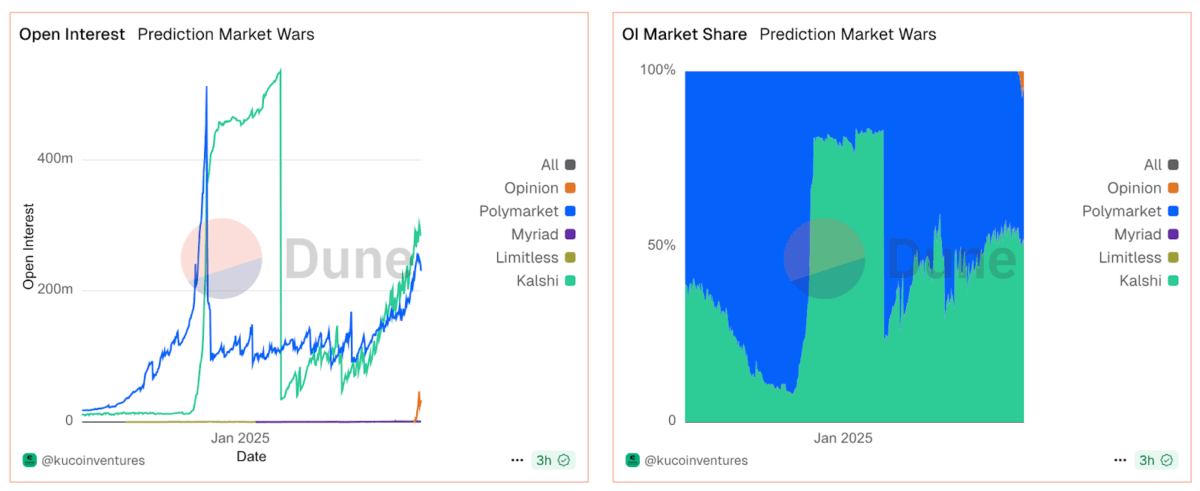 Polymarket曾长期控制70%以上的未平仓合约,但2025年Kalshi逐渐缩小差距。与此同时,Myriad、Limitless等小型平台活跃度提升,显示市场正趋向多元化竞争。