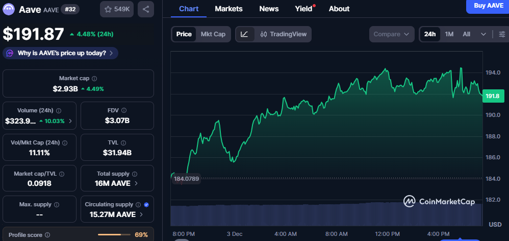 Aave当前市值约29.3亿美元,市场地位稳固。近24小时交易量达3.239亿美元,呈现持续增长态势。交易量上升表明市场关注度提高,更多资金正在涌入。此外,平台锁仓总值达到319.4亿美元,成为衡量协议成功与否的重要指标。