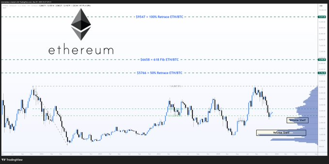通过ETH/BTC汇率推导的延伸目标同样值得关注:50%回撤位对应5766美元,0.618水平指向6658美元,完全回撤目标则定格在9547美元。这些预测映射出长期汇率走势暗藏的方向性偏好。