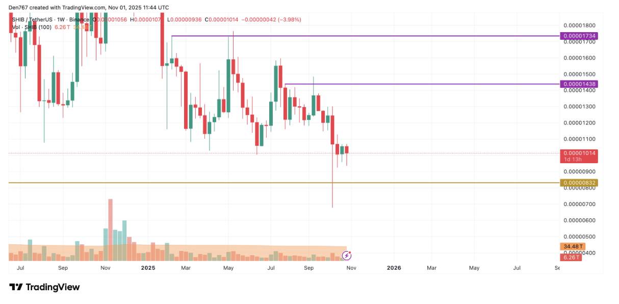 中期来看,买卖双方在力量平衡方面表现谨慎,导致波动率持续走低。SHIB现报0.00001014美元。若成交量放大,SHIB有望在2025年第四季度启动新一轮上升趋势。