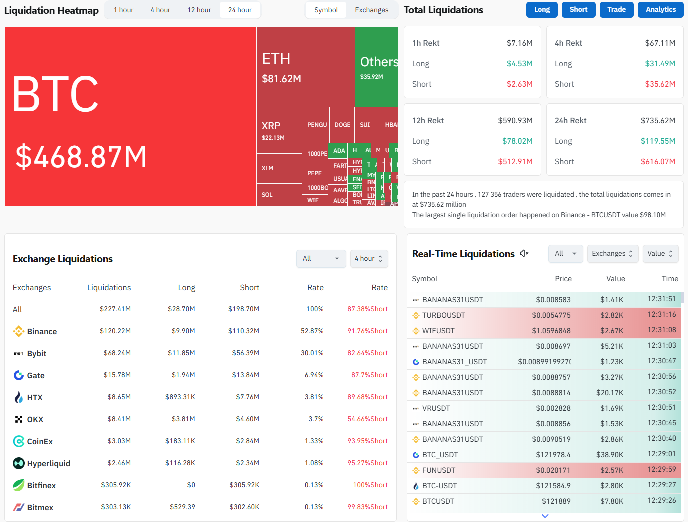 比特币市值现已突破2.04万亿美元,正式超越亚马逊跻身全球前五大资产之列。但这场盛宴不仅限于价格表现——在整个衍生品市场,一场巨大的连锁清算风暴正在上演。过去24小时内,价值近7.32亿美元的杠杆仓位被摧毁。