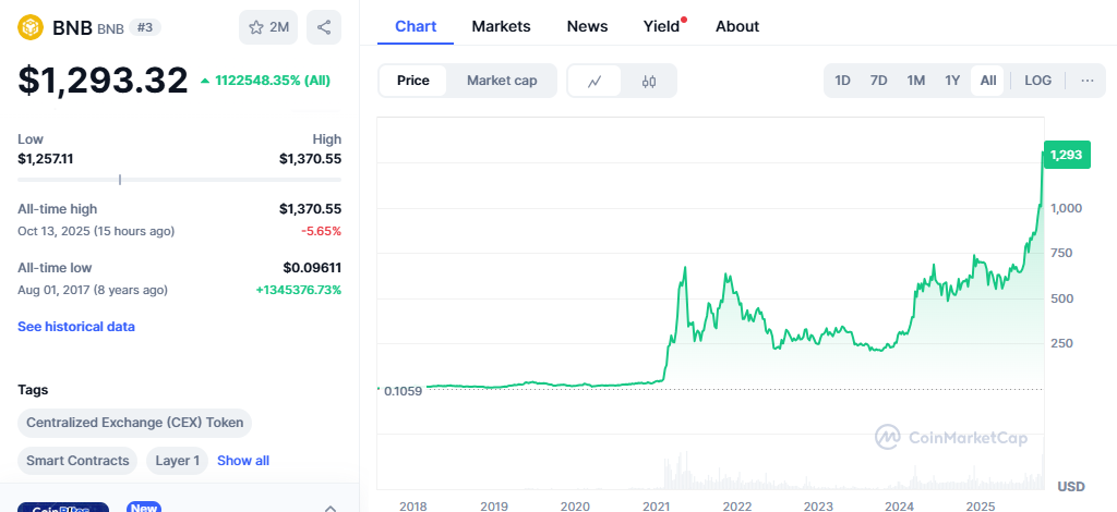 BNB代币延续强势表现。10月13日,这家交易所系加密货币突破1,370美元大关,再创历史纪录。