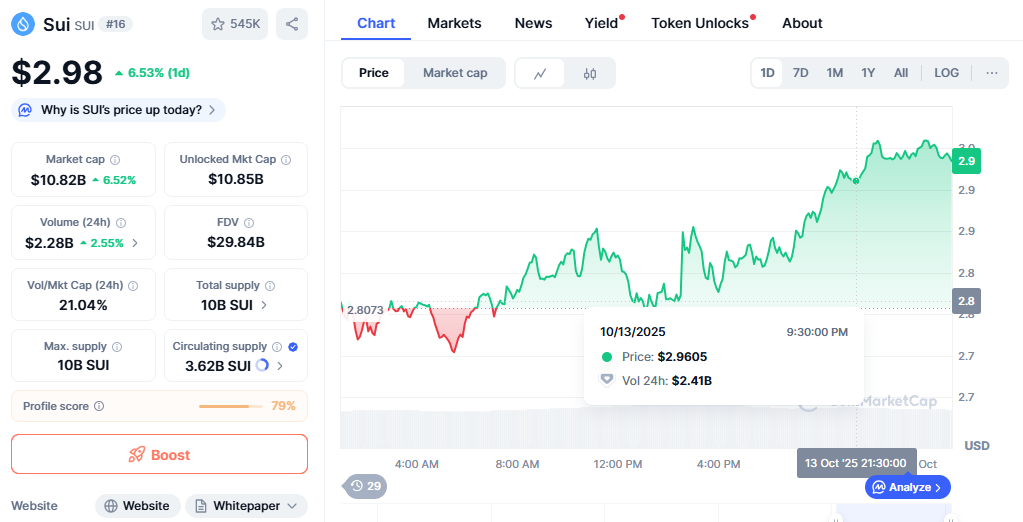 据CoinMarketCap数据,SUI目前市值108亿美元,虽位列TOP20,但基本面扎实使其具备可观上升空间。该平台24小时去中心化交易所交易量达9.05亿美元,永续合约交易量1.22亿美元,显示出强劲生态活力。当前2.9美元的价格被普遍认为具备投资价值。