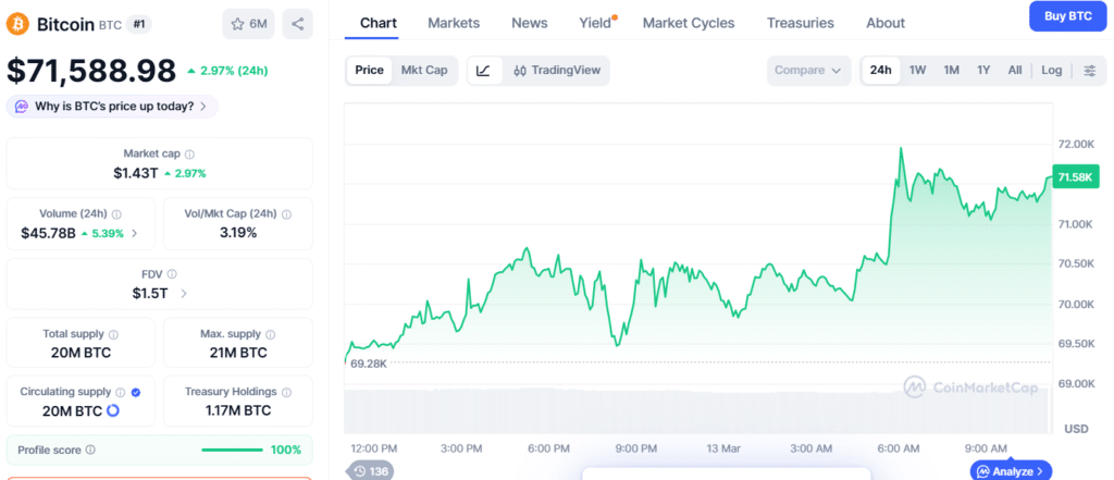 近期市场数据显示,比特币在过去24小时内上涨了2.97%,目前交易价格约在71,598.81美元。与之前几周相比,这一表现标志着显著转变,凸显出当前市场消化重大外部冲击、在波动条件下保持稳定的能力已大幅增强。