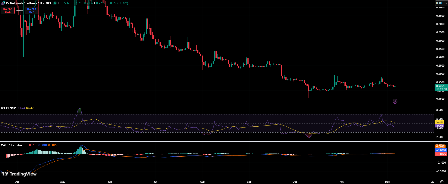 尽管生态系统持续升级且整合范围不断扩大,Pi的市场表现仍相对平淡。截至撰稿时,PI交易价格接近0.2265美元,日内微涨约1.3%,但整体走势图显示在经历早期下跌后已持续数月的横盘整理。