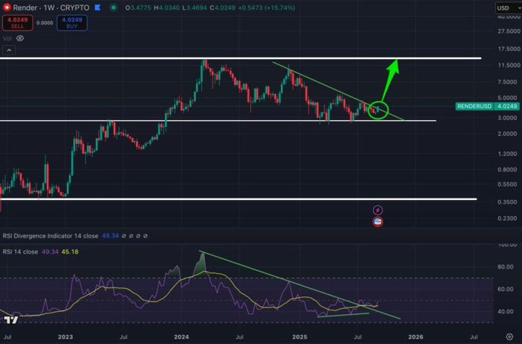 当前最值得关注的是价格所处位置:正测试一条自2023年中旬压制RENDER的长期下降趋势线。若能有效突破这道壁垒,整体格局将彻底改变,为更大规模的上涨打开通道。