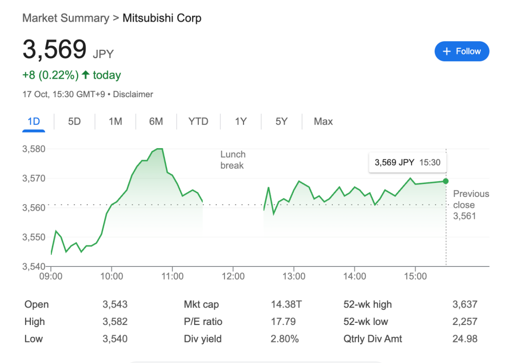 公告发布后,三菱商事股价呈现温和上涨态势,10月17日收盘报3,569日元,上涨8日元(0.22%)。当日交易区间维持在3,540至3,582日元之间窄幅波动,显示投资者情绪稳定,市场波动有限。