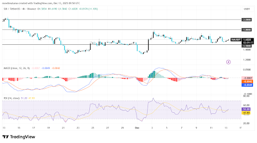 SUI价格在24小时图表持稳后交易于1.60美元附近。该代币从近期低点反弹后显示出温和的上行动能。价格走势仍受制于1.80美元阻力位,此前多头多次尝试突破该位置未果。