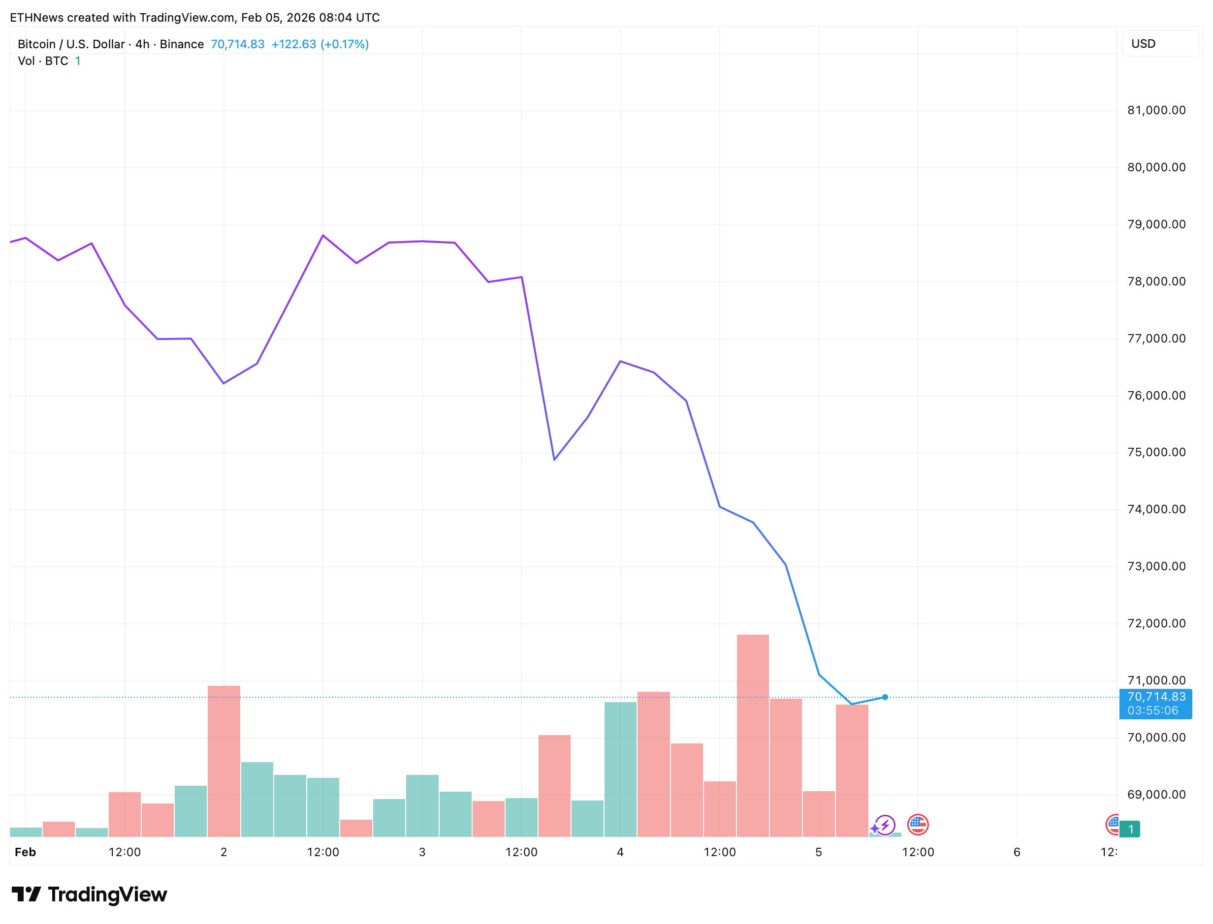 “比特币在77,000美元时,我猜买家会一拥而上将其推回82,000美元。”——吉姆·克莱默 (@jimcramer) 2026年2月1日